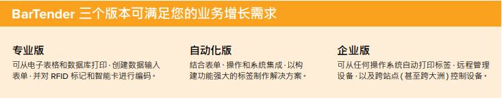 使用 BarTender可以轻松地创建、自动打印和管理条形码、标签、RFID 标记等。BarTender是一款简单且可扩展的解决方案,它有三个版本,适用于各种规模的企业。BarTender 通过强化以下基本功能来完善您的标签制作解决方案: